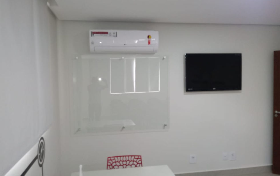 Sala no 2º pavimento, com 20 cadeiras para alunos, mesa e cadeira para instrutor, lousa de vidro, TV, ar-condicionado, copa com mesa e 04 bancos, e banheiro privativo.